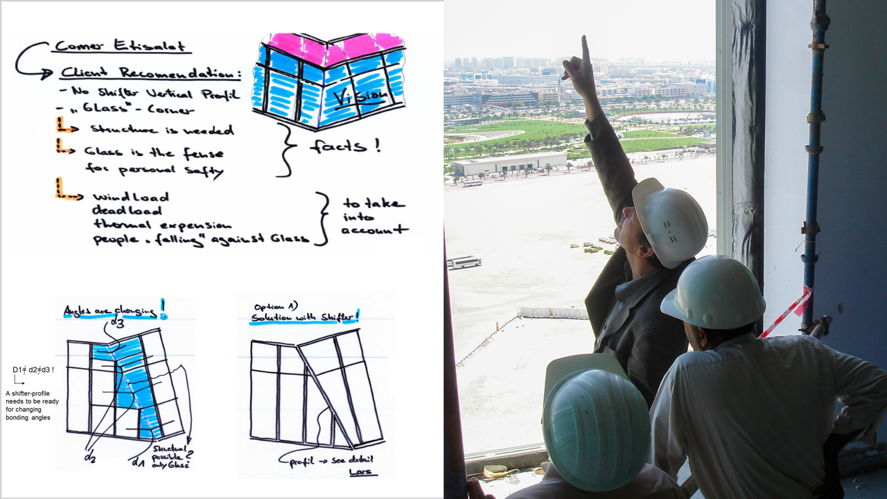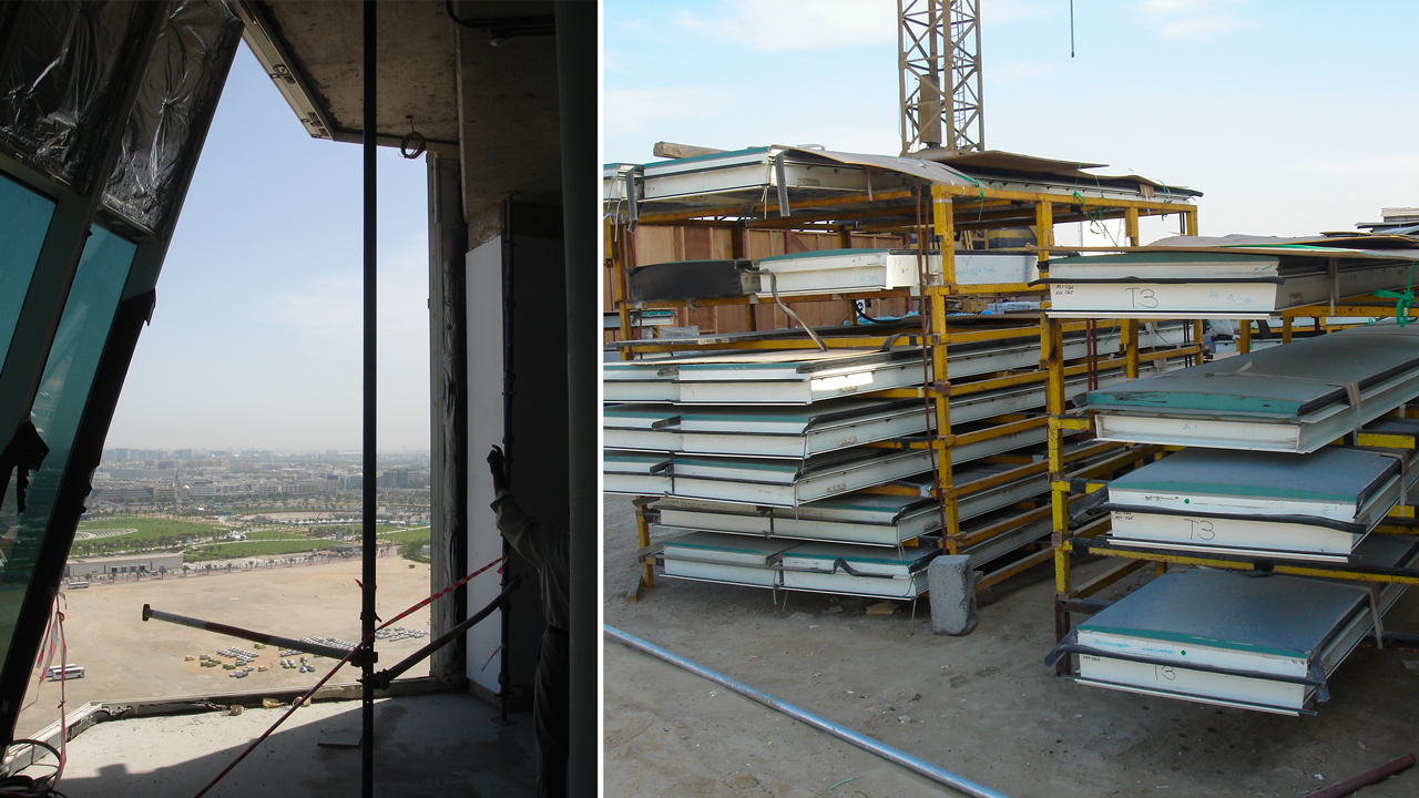 Die Baubranche im Middle East wächst nach wie vor. Doch wie tickt dieser Markt? Zeit, das herauszufinden, hatten wir nicht: Als wir 2005 feuerwehrartig zum Etisalat Building nach Dubai gerufen wurden, stand dies zwar kurz vor der Fertigstellung, allein der Fassade fehlte es buchstäblich an allen Ecken und Enden. Das geometrisch anspruchsvolle Gebäude hatte zwei offene Flanken, die sich über alle 33 Geschosse erstreckten. Jede der insgesamt fast 100 Ecken war anders, hinzu kam eine leichte Krümmung der Fassade, nirgends gab es einen rechten Winkel. Insgesamt waren die Toleranzen zwischen Ausführung und Planung so groß, dass nicht weiter auf Grundlage des vorhandenen Planmaterials gearbeitet werden konnte. Und in 6 Monaten wollte der Bauherr Eröffnung feiern. Was also tun?