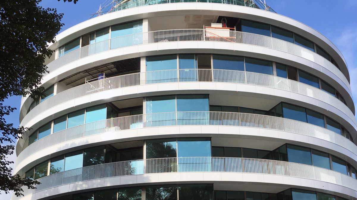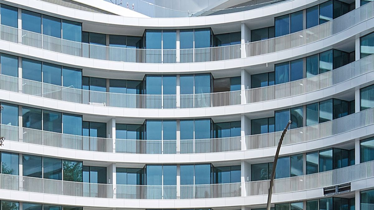 Für die Balkone, natürlich mit Alsterblick, schlugen wir ein Schiebetürsystem mit ultraschmalen Profile vor, um eine ungestörte Aussicht zu ermöglichen. Für das Atrium konzipierten wir eine farbig akzentuierte, aus sich heraus leuchtende Schuppenfassade, für die kein übliches System verfügbar war und Brandschutzanforderungen erfüllen musste.