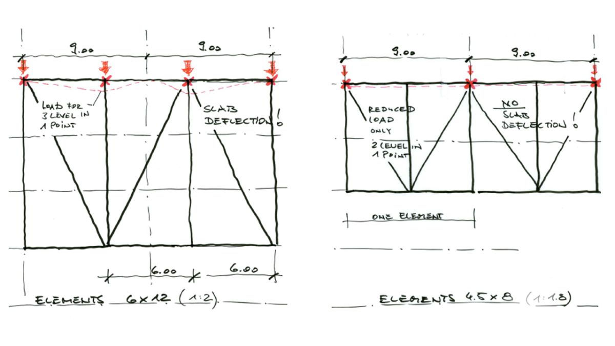 Im Ursprungsentwurf mit 6 × 12 Metern geplant, schlugen wir vor, das Raster auf 4,5 × 8 Meter zu ändern. So passte es exakt zum Stützenraster, die Lasteinleitung in den Rohbau konnte gleichmäßiger erfolgen und die Durchbiegung an den Deckenkanten wurde vereinheitlicht. Gleichzeitig verringerten sich durch die reduzierte Höhe die einzuleitenden Lasten und die geringeren Spannweiten ermöglichten kleinere Profil-Querschnitte und Wandstärken.