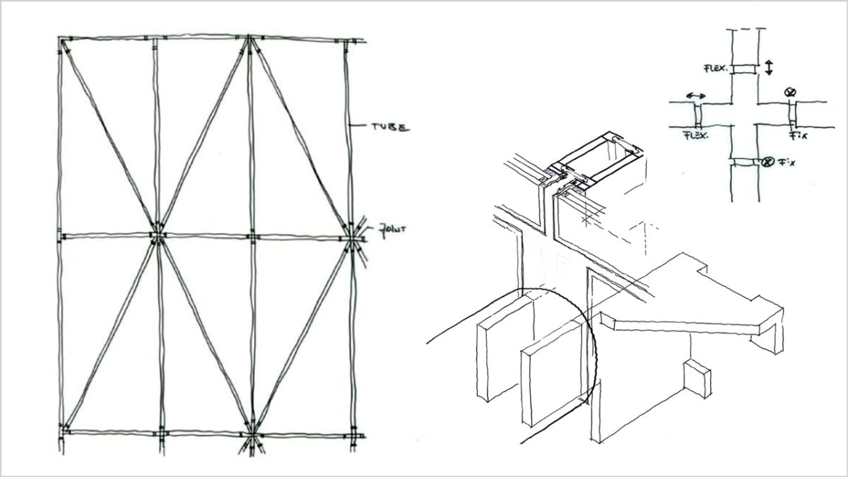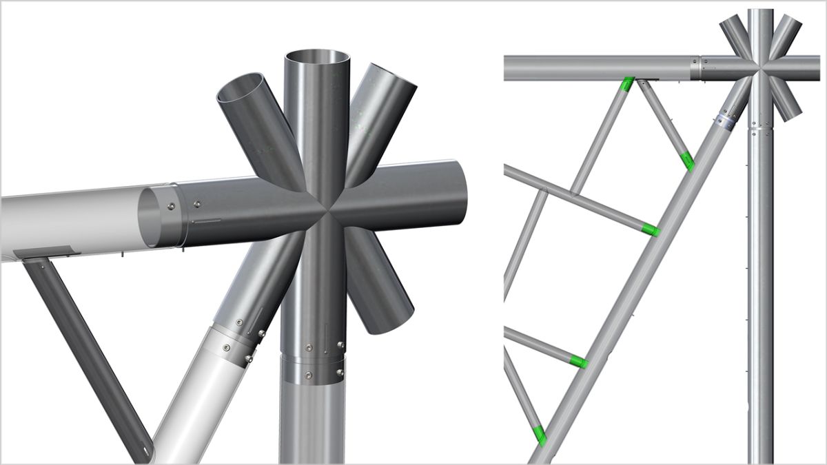 Neben Vorschlägen für die Materialien der Gebäudehülle, die Konstruktion und die Füllungen – die wir als Entscheidungshilfe und Diskussionsgrundlage als 3D-Modelle renderten – untersuchten wir, mit Blick auf den Montageablauf, mögliche Rohrquerschnitte, verschiedene Eckknoten sowie die Anordnung der Los- und Festpunkte.